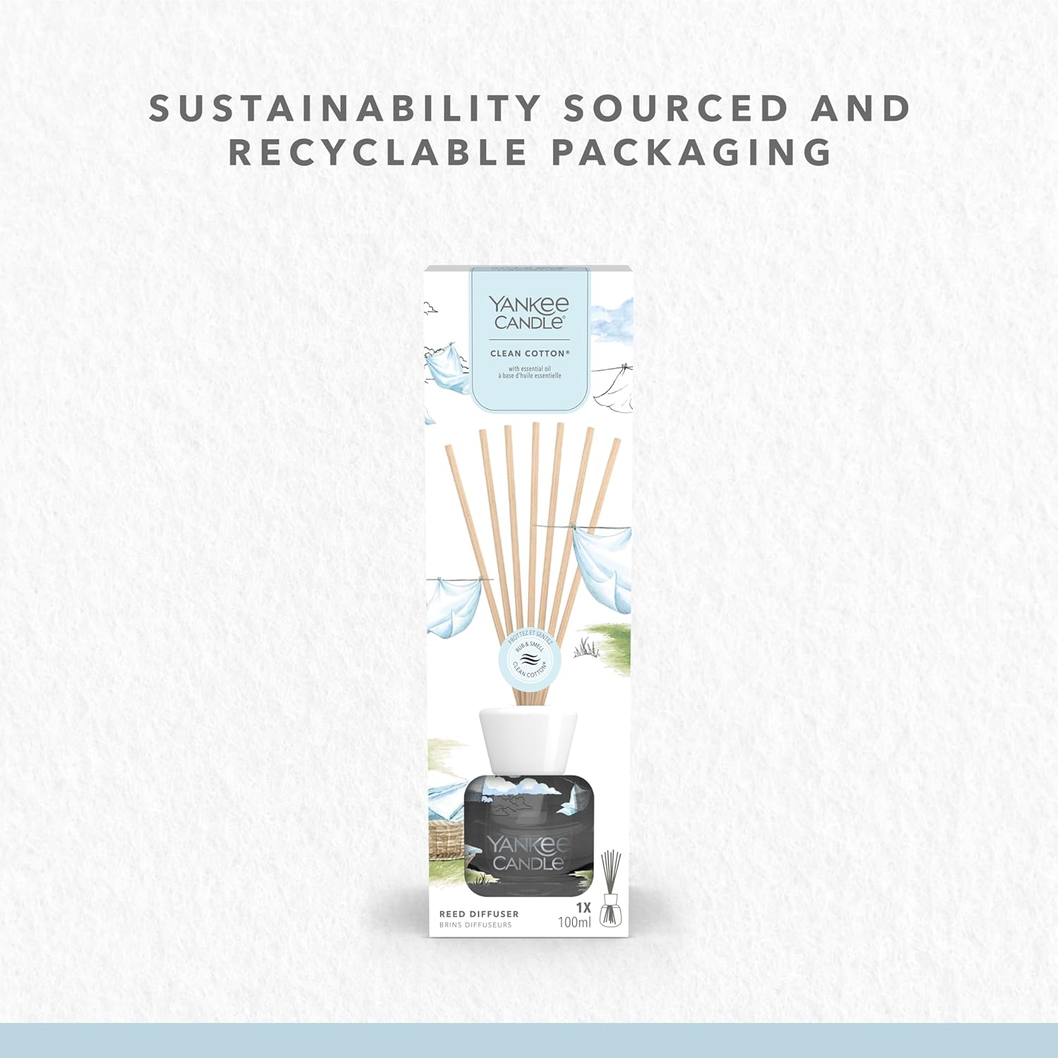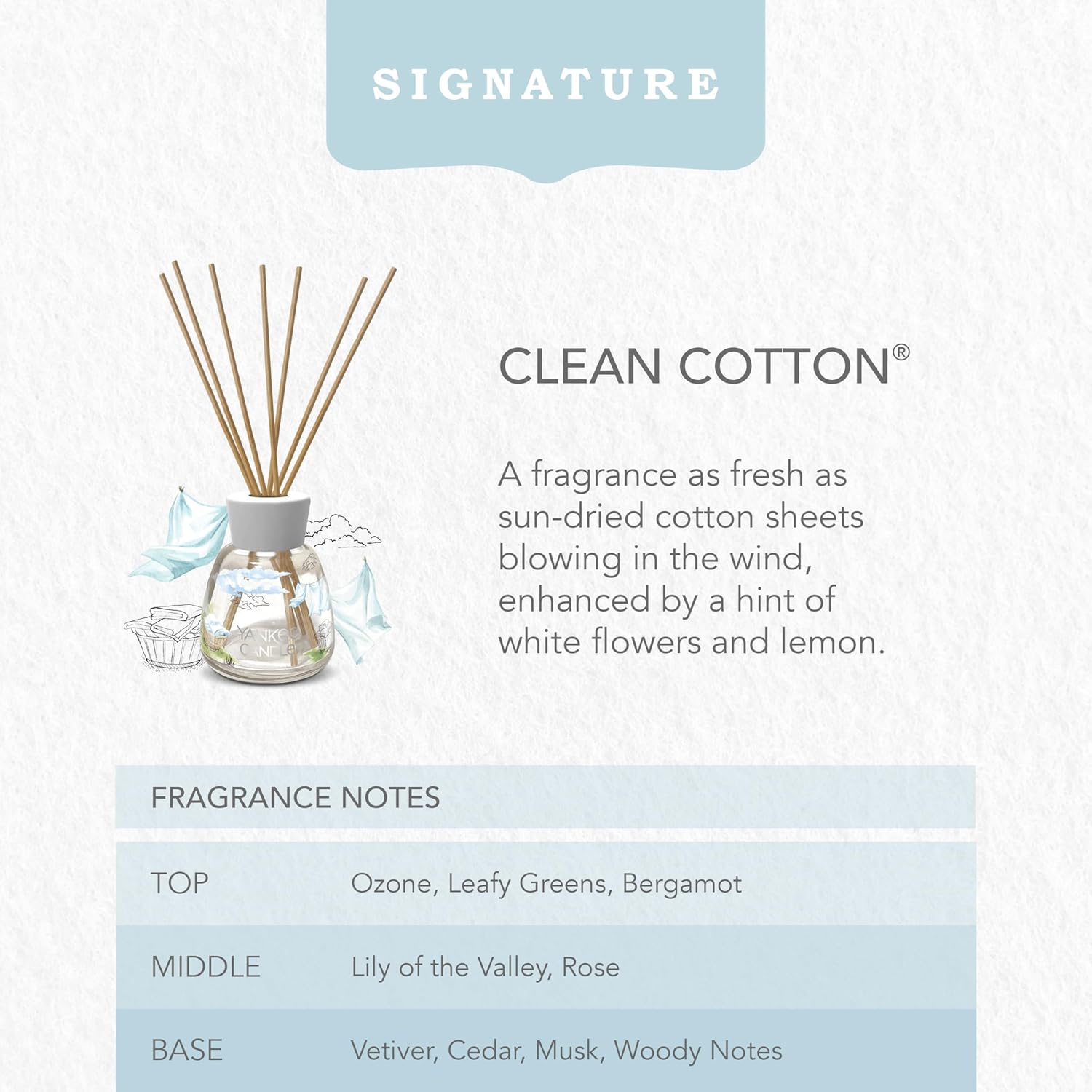Clean Cotton® captures the crisp, fresh scent of sun-dried laundry billowing in a gentle breeze. Bright notes of ozone and leafy greens evoke the pure air of a summer’s day, while delicate lily of the valley and soft rose add a floral elegance. A grounding base of vetiver brings warmth and depth, completing this uplifting and comforting fragrance. Perfect for those who love the scent of freshly washed linen, Clean Cotton® brings a sense of freshness and purity to any home.